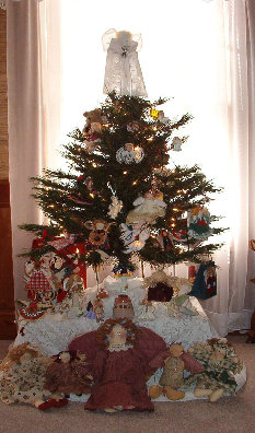 After last year, I knew I could not do it again. I could not get out that large tree and those ornaments of memory and live through that sadness and pain another season. When I packed everything away, I knew it would be a long time before I would see them again. So, this year, we got down a small tree that was in the attic. I had used it several times on the hearth in the family room and had lights on it. Well, this year, it was our main tree, and we had to put it on a box to make it large enough in front of the windows. I gathered together quite a few angel dolls and angel things, and then Mac put the lights on it and I added my things to its branches. It's sort of like Charlie Brown's tree, and somehow the uneven side got to the front. It's full of angels! A very sweet friend had sent an angel boy with "Ken" inscribed on the front of it, and I placed it right near the top and it just glows! Since it's in the family room, we can enjoy it so much more!
